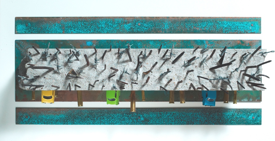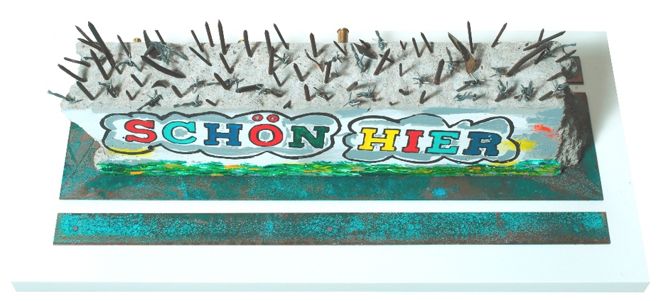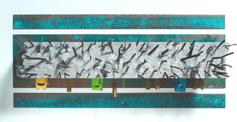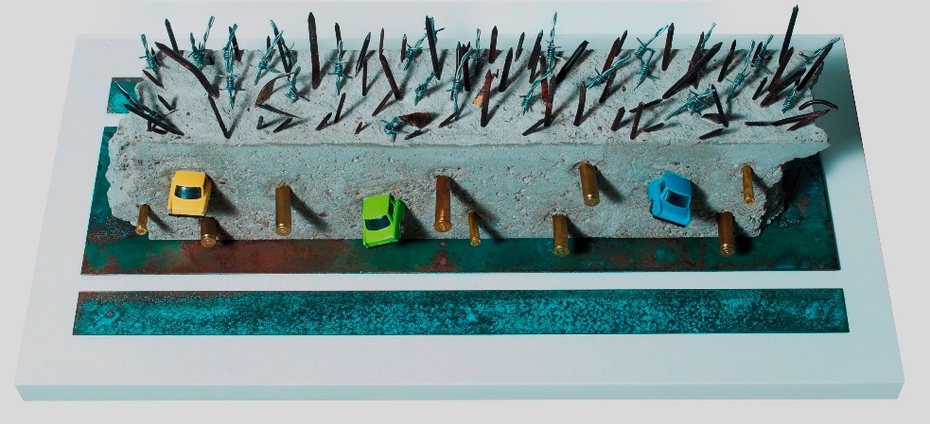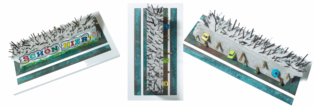 MDF Bodenplatte 68 x 35 cm, Höhe 25 cm, Gewicht 22 Kg, Kupferplatte mit Patina, Mauerbeton, Graffiti, Nägel, Stacheldraht, Metallsplitter, Trabbis, Patronenhülsen