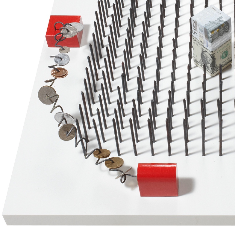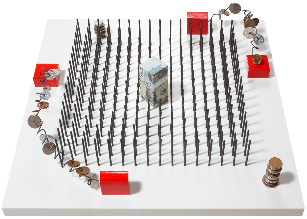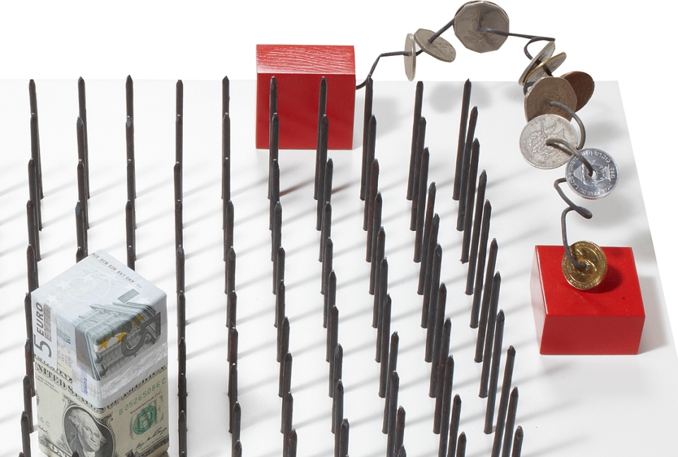 Welt Zahlungsmittel, Geldmünzen Türme, rostige Nägel in Wellenform angebracht,