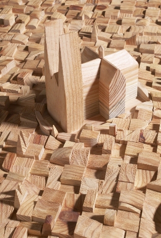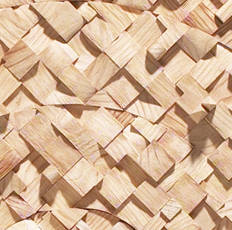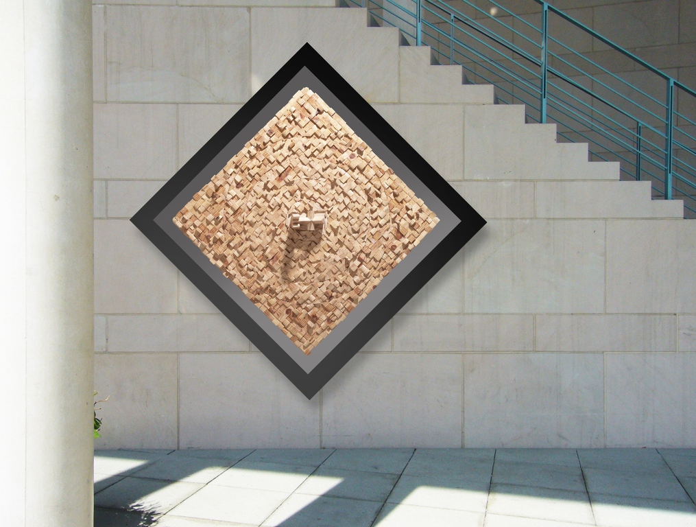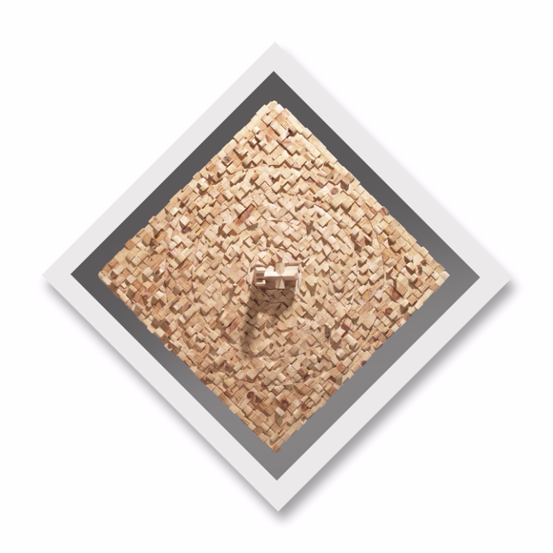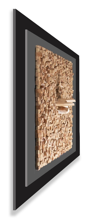 MDF-Trägerplatte 120 cm x 120 cm, seidenmatt lackiert lichtgrau, Glasplatte in Anthrazit 100 cm x 100 cm, Pinienholzfragmente unterschiedlich hoch, in Kreisen angeordnet um den Dom