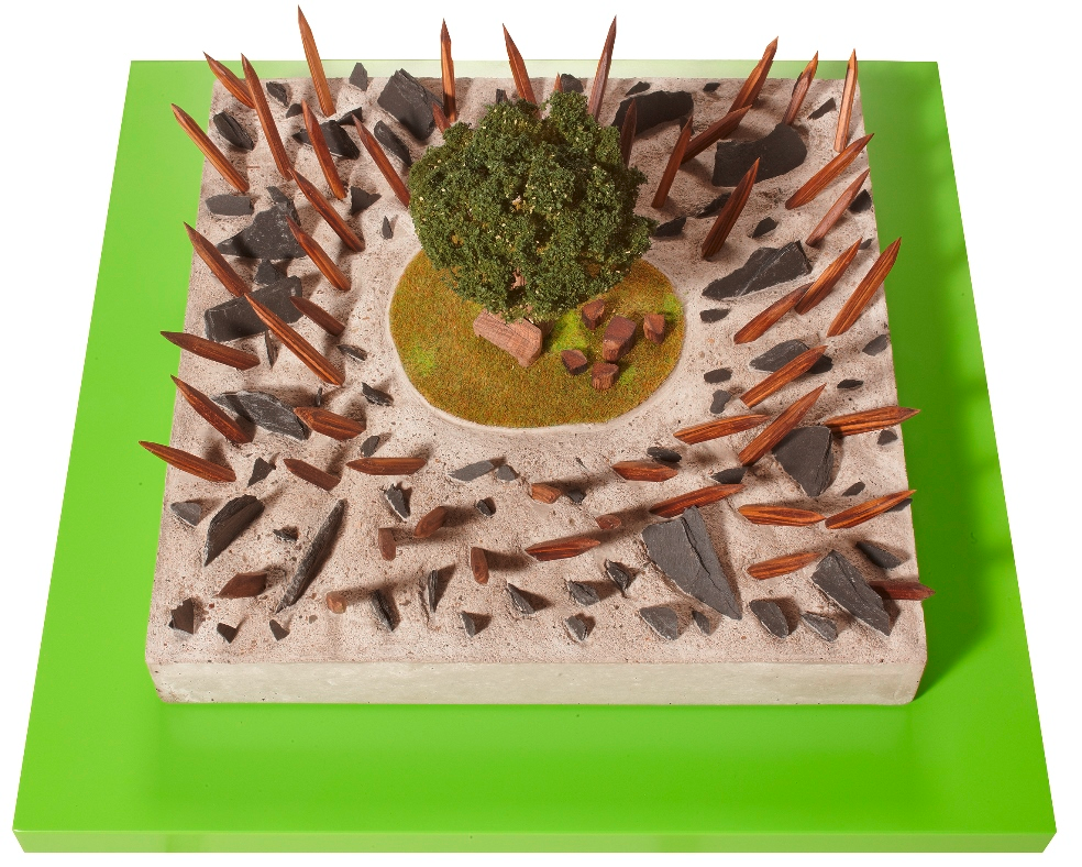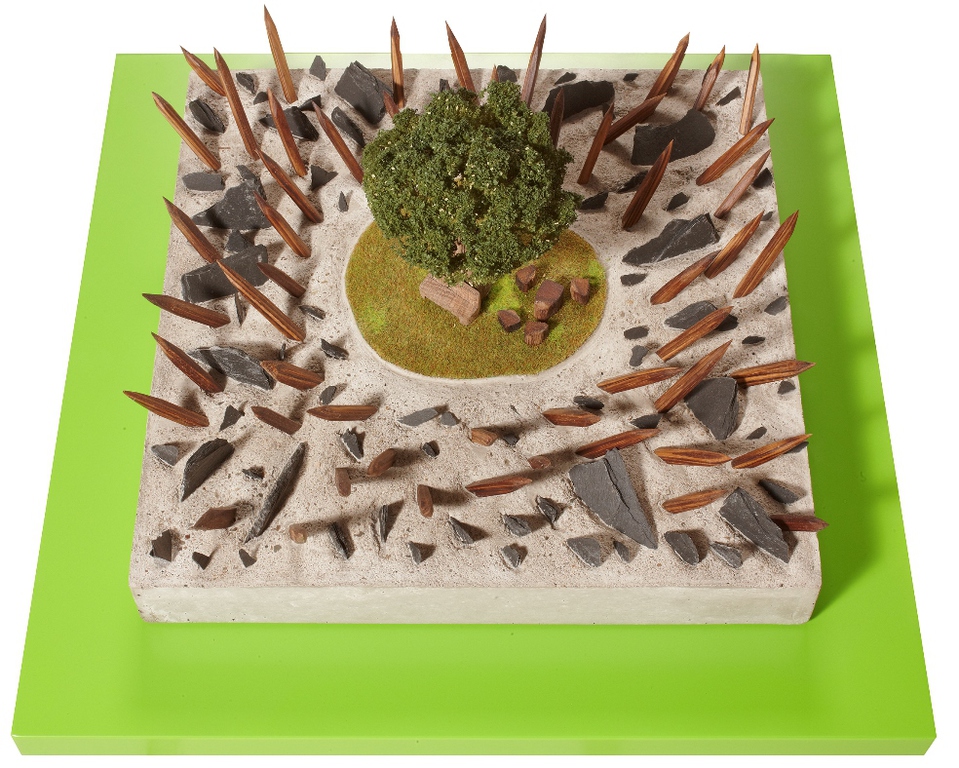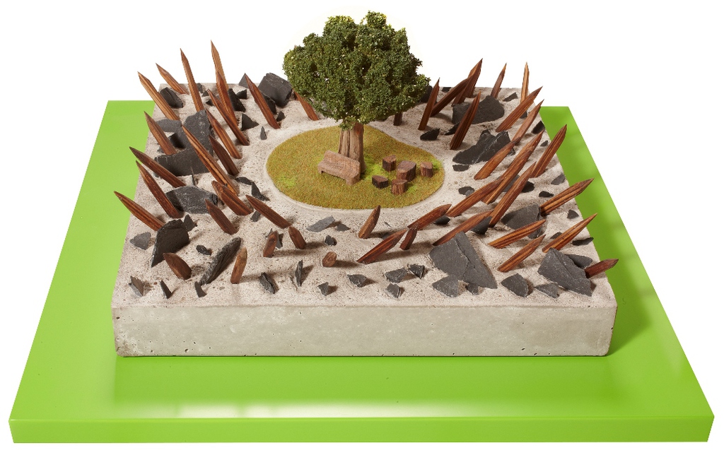 Betonplatte 36 cm x 36 cm, mit Edelholzstiften, Schieferbruchplatten, Apfelbaum, Sitzplätze