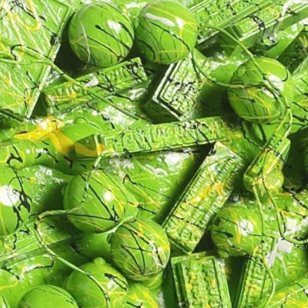 Betonplatte 36 cm x 36 cm, Nägel seitlich im Beton eingelassen, Stempel, Stempelkissen, Stahldraht verschiedenfarbig lackiert